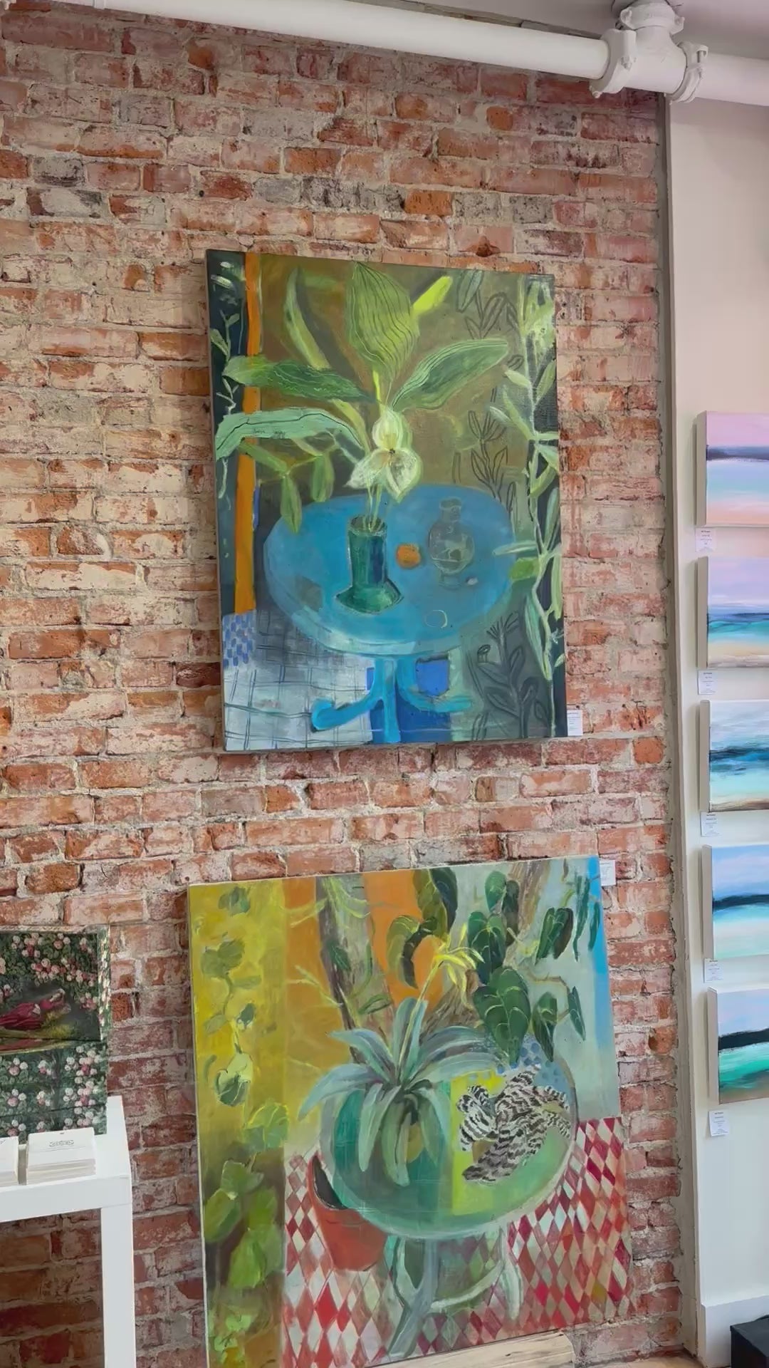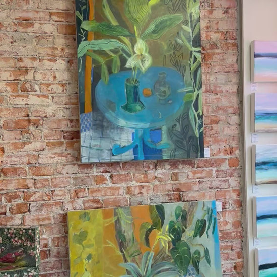Endres draws inspiration from domestic interiors, botanical forms, and observed moments gathered during walks—where nature and introspection intertwine. Her paintings often feature intimate tablescapes, plant life and imagined figures. These layered compositions reflect a practice rooted in reflection, observation, and the interplay between the inner and outer worlds.