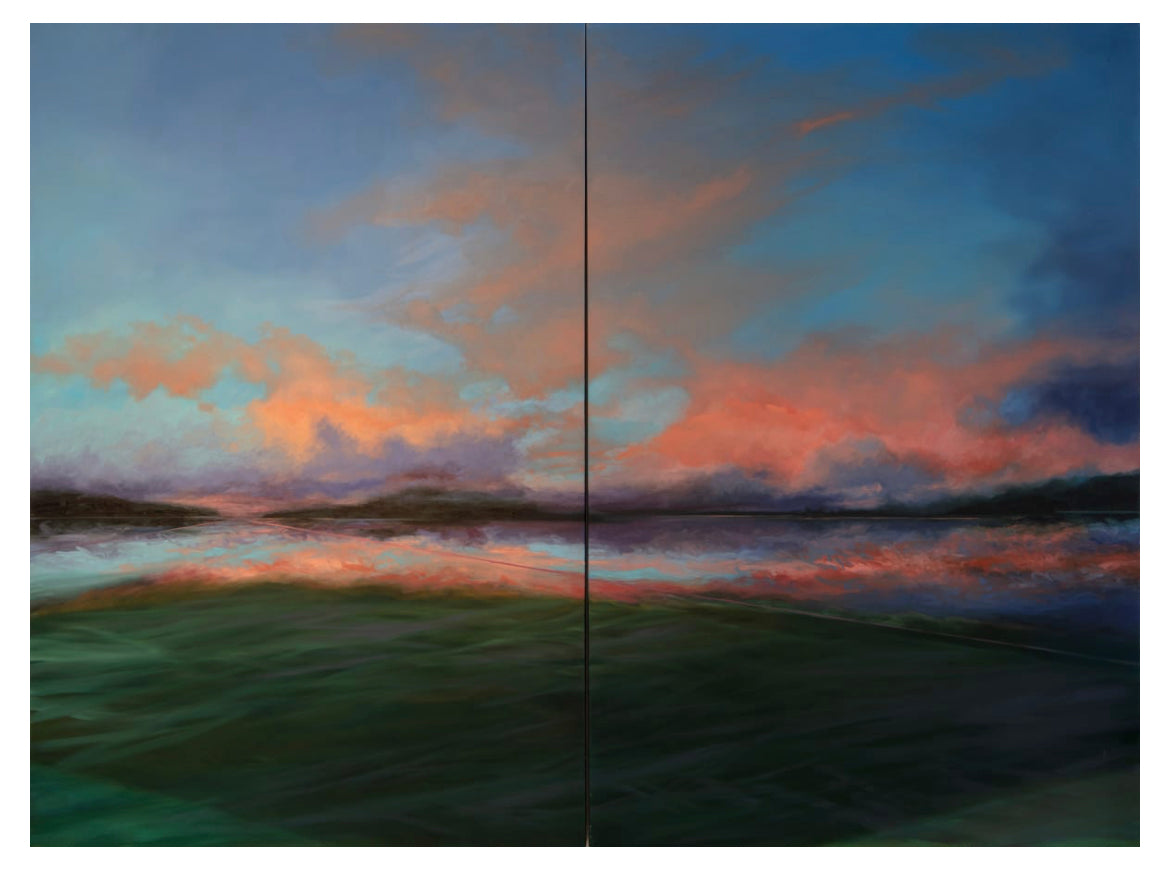 Myriad conditions of light created by the time of day and the weather illuminate textures in the water, patterns in the clouds, and juxtapositions of color that richly vibrate with one another to form the visual experience of the landscape. The morning light slowly eases up over the horizon, gently lighting the clouds, and later seen from the same vantage, the evening fire of the sunset races through the darkening sky. These dynamic combinations of light, shape, pattern. and color inspire my work.