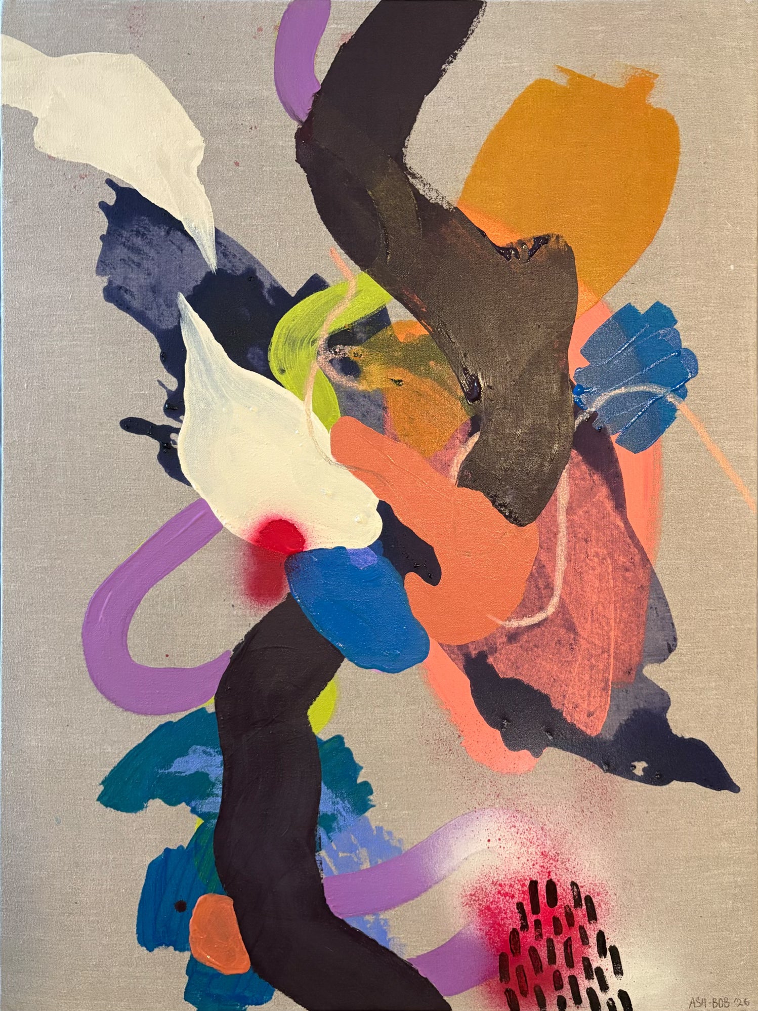 Ash-Bob’s mixed media paintings utilize abstract forms to highlight the ever-present theme of duality and contradiction within her personal identity. She finds that expressing such vulnerabilities allows her to work through her cognitive dissonance and multifaceted personality. In her newest body of work, she explores her artistic relationship with the term “body” through an examination of perception and function surrounding the body.